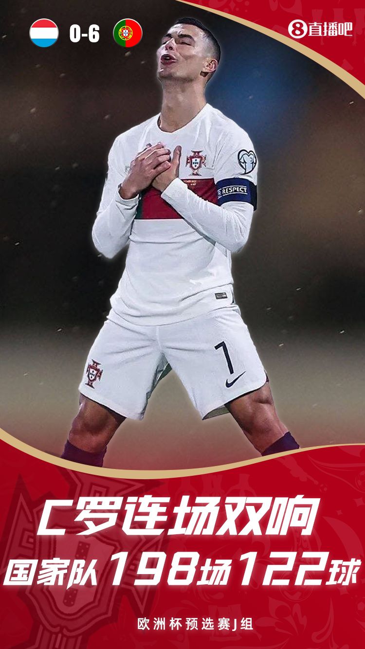 玩球网3月27日讯欧洲杯预选赛J组,葡萄牙6-0大胜卢森堡,C罗连场双响,国家队生涯198场122球!另据统计,C罗11次面对卢森堡打入11球!C罗第一球↓C罗数据:俱乐部:959场710球国家队:1