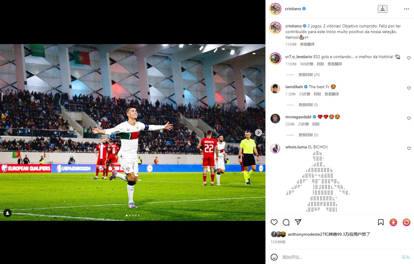 玩球网3月27日讯欧洲杯预选赛J组次轮,葡萄牙客场6-0卢森堡取得两连胜。赛后,C罗在ins中写道:“两战两胜!很高兴为我们国家队这非常积极的开局做出贡献。加油????????”据统计,C罗在两轮欧预赛打入4粒进