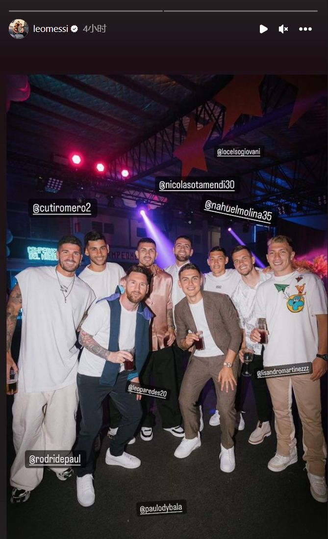 玩球网3月27日讯阿根廷在友谊赛中2比0击败巴拿马,并举行世界杯夺冠庆典,而庆典之后梅西参加了派对,他在社交媒体上晒出相关照片。梅西更新社交媒体动态,晒出自己与迪马利亚、德保罗、罗梅罗、奥塔门迪、莫利