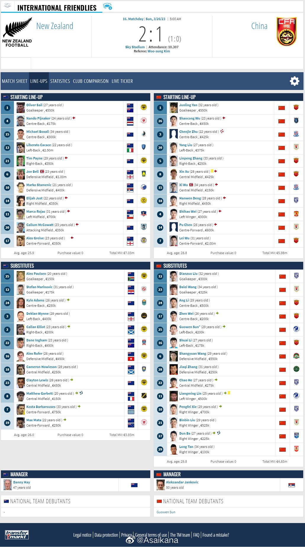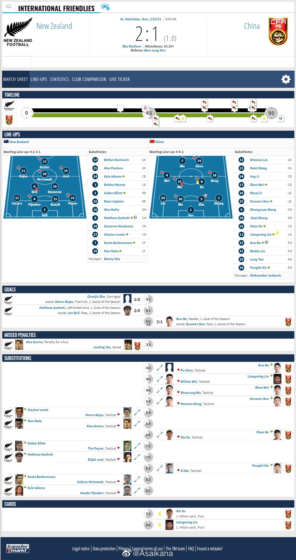 国际友谊赛 新西兰 2-1 中国 比赛报告