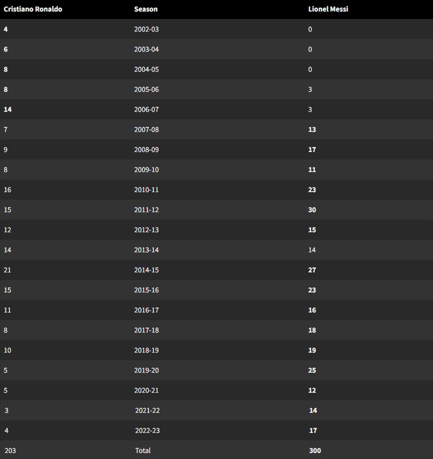 梅罗俱乐部助攻:C罗203次&9个赛季上双,梅西300次&16个赛季上双