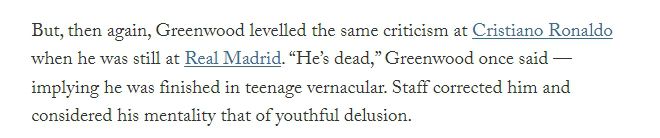 玩球网3月27日讯 The Athletic今日发布长文,再次分析了格林伍德事件的前前后后,其中涉及到格林伍德的性格养成。 文中表示格林伍德从小桀骜不驯,一些言语也比较出格。在他16岁的时候他就知道自己是一名优秀的球员,而他曾经骂过其他同龄球员是屎。 当C罗还在皇马的时候,格林伍德还批过C罗,他说:“他死了。”,想表达的是他已经完了。工作人员纠正了他,并认为他的精神状态是青少年妄想症。 原文↓ |