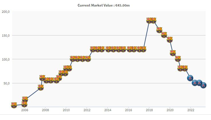 玩球网3月27日讯今日德转更新部分法甲球员身价,梅西身价下降500万欧,目前德转身价4500万欧。在2022年11月2日的更新时,梅西身价为5000万欧。
