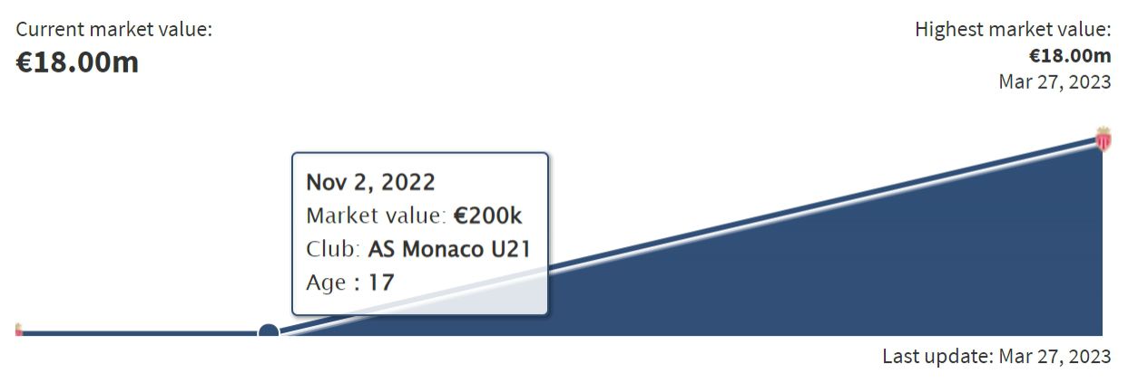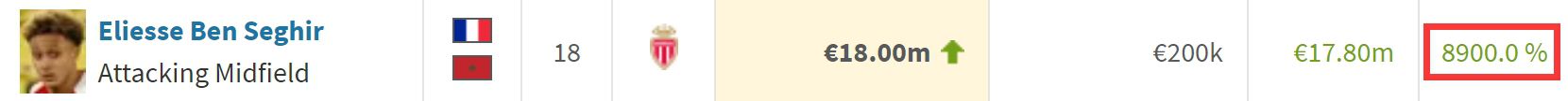 玩球网3月27日讯今日转会市场更新法甲球员身价,在涨幅排行榜上,摩纳哥18岁小将本-萨赫尔达到了惊人的8900%。去年11月更新时,这位法国&摩洛哥双国籍前腰身价仅仅20万欧,如今已经1800万欧。本