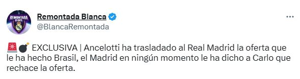 玩球网3月28日讯西班牙媒体RemontadaBlanca独家消息,安切洛蒂将巴西队为自己递交报价一事告知皇马,然而皇马并没有让他拒绝这份报价。根据此前报道,皇马主帅安切洛蒂与巴西国家队帅位联系在了一