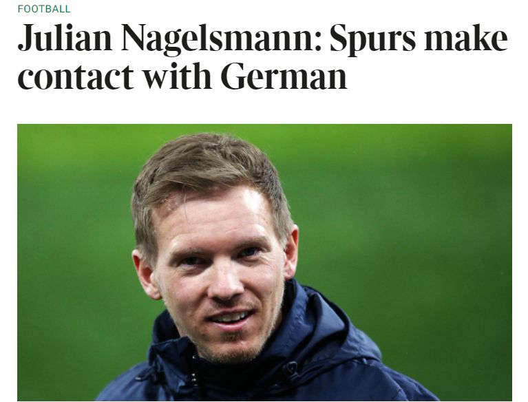 玩球网3月28日讯据英国《泰晤士报》报道,在与主帅孔蒂分道扬镳后,热刺已经开始选帅进程,并且于上周末与刚刚从拜仁下课的纳格尔斯曼取得了联系。为避免在任命新帅时遭遇以往的混乱情况,热刺希望尽快与新帅候选