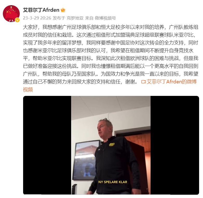 玩球网3月29日讯瑞典超球队米亚尔比官方宣布,中国U20队长艾菲尔丁加盟球队。艾菲尔丁即将开启留洋之旅,他在社媒发表感想。艾菲尔丁:大家好,我想感谢广州足球俱乐部和恒大足校多年以来对我的培养,广州队教