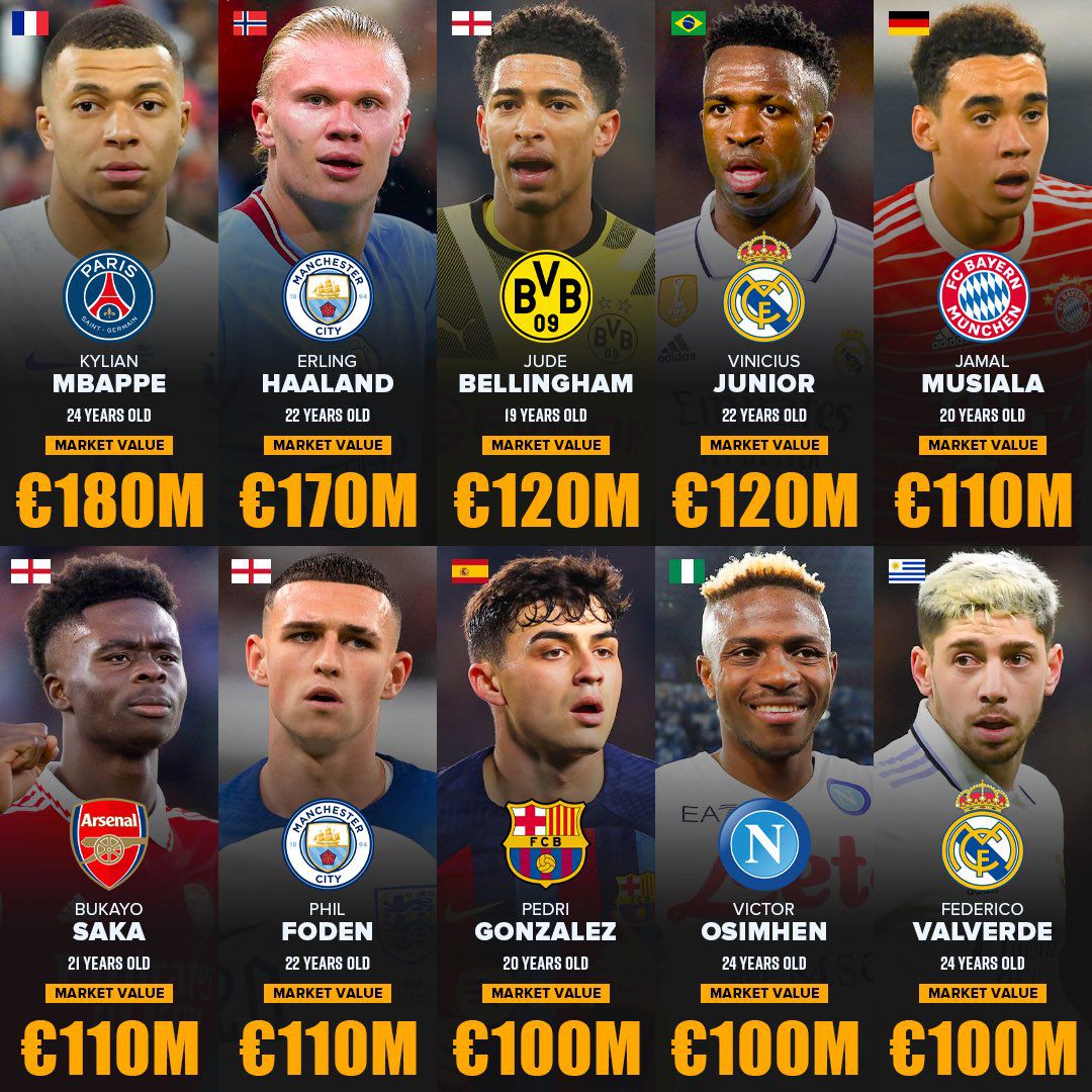 近日,德转再次更新,身价过亿的球员来到10人: 1.姆巴佩:1.8亿,巴黎 2.哈兰德:1.7亿,曼城 3.贝林厄姆:1.2亿,多特 4.维尼修斯:1.2亿,皇马 5.穆西亚拉:1.1亿,拜仁 6.萨卡:1.1亿,阿森纳 7.福登:1.1亿,曼城 8.佩德里:1亿,巴萨 9.奥斯梅恩:1亿,那不勒斯 10.巴尔韦德:1亿,皇马 (单位:欧元) |
