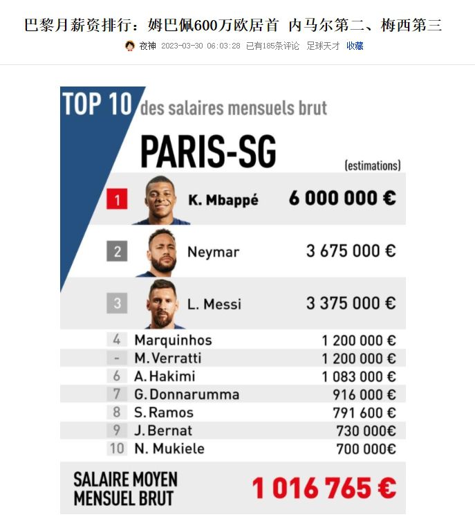 法国《队报》披露,姆巴佩月薪600万欧元,在巴黎队内最高,相当于梅西的1.7倍。折合人民币,姆总月薪高达4476万人民币。