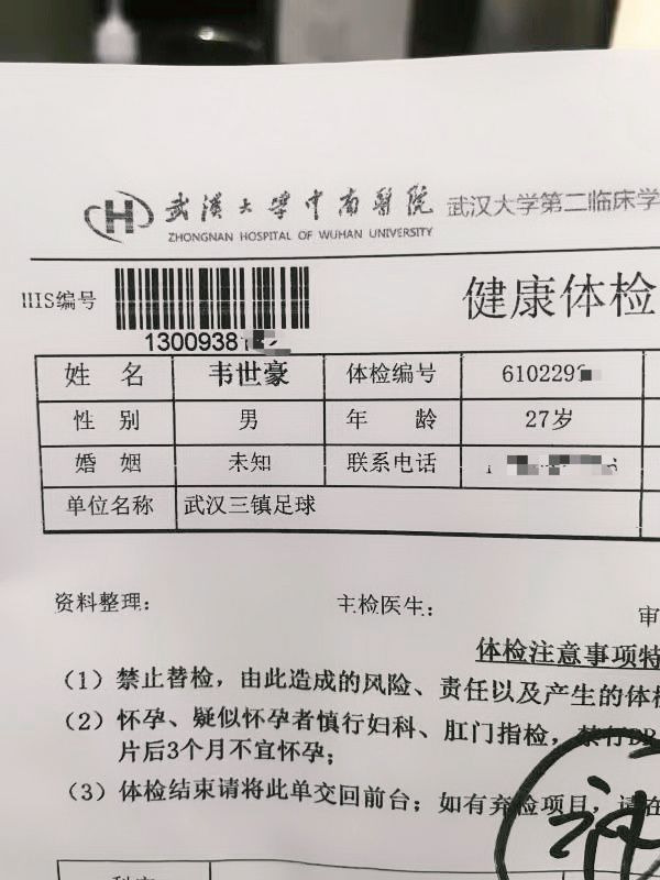 玩球网3月30日讯 博主“武汉足球情报小组”晒出韦世豪体检单,并配文:欢迎韦世豪加盟武汉!