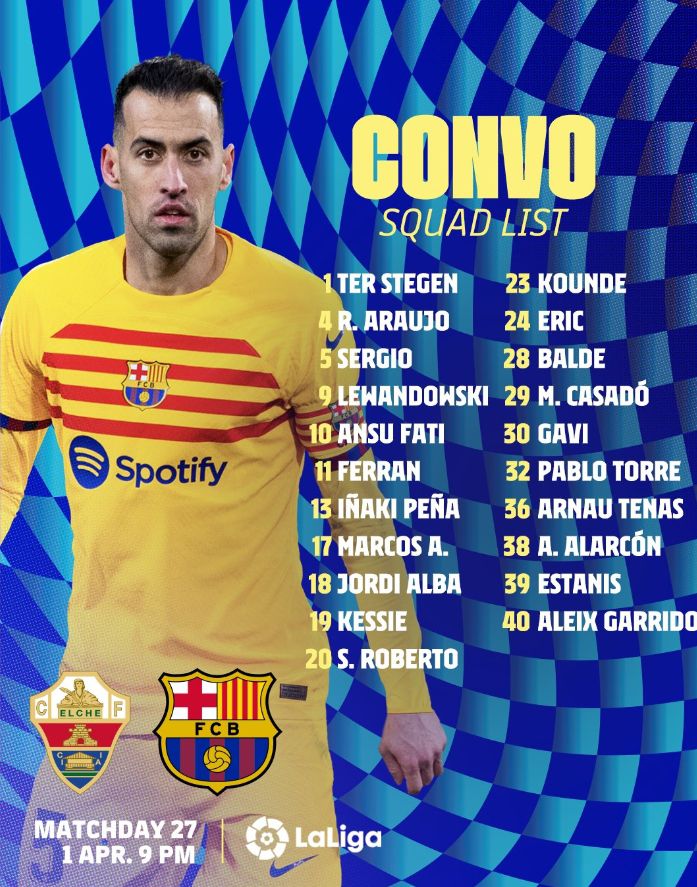 玩球网3月31日讯北京时间4月2日凌晨3:00,2022-23赛季西甲联赛第27轮,巴塞罗那将在客场挑战埃尔切。赛前,巴萨公布了本场比赛球队大名单,莱万在列,阿劳霍复出,佩德里、登贝莱继续缺席。巴萨具