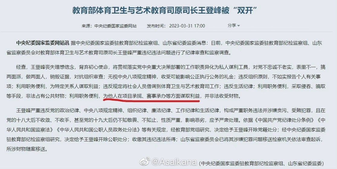 王登峰双开公告今日发布,从去年接受调查到现在进展还是很快的。他大多数问题是教育系统的事,他在足协也只是个挂名的副主席,从案件主办机构就能看出他不是此次李铁系列案件的一员。但在官宣公告里,提到了他曾为他人在“赛事承办”方面谋取利益,并非法收受财物。也足以看出行业不正之风侵蚀足球之深,青少年赛事当然也不例外。这些赛事承办单位,恐怕是给领导送礼开道讨方便已经成了家常便饭。能在青少年赛事这么干,在其他赛事里这么干也不足为奇了。大家都这么干,竞争不上的单位只好效仿,这个行业就是这么烂到根的。 |