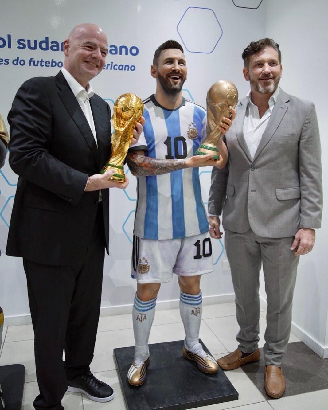来看看世界冠军????因凡蒂诺与梅西手捧大力神杯的蜡像合影
