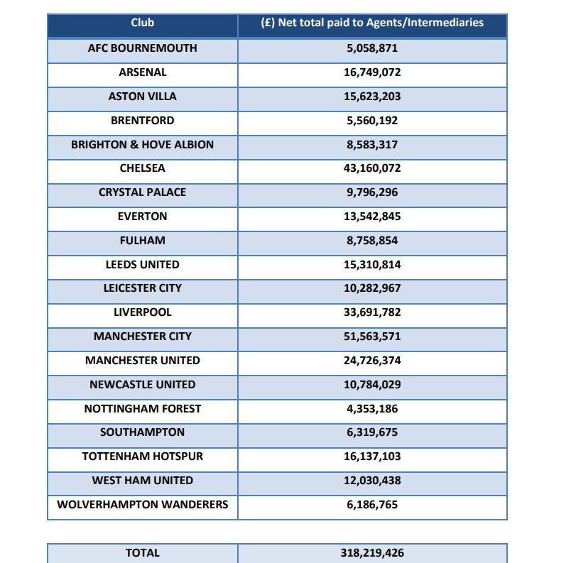 玩球网4月1日讯电讯报记者MartynZiegler消息,英足总公布报告,英超20支队伍在2023年冬窗、2022年夏窗这两个窗口,共在经纪人/中间人佣金上支出了3.18亿镑,其中曼城支出最高。按支出