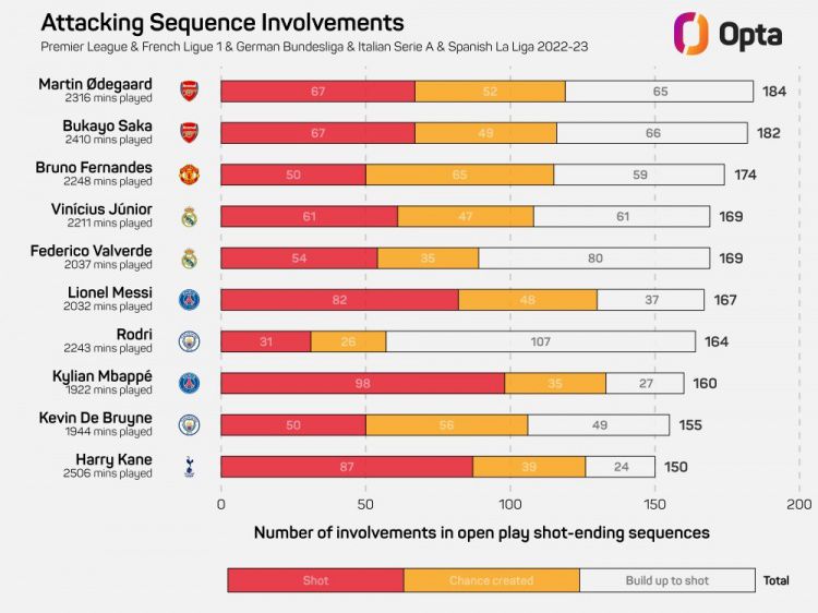 玩球网4月1日讯数据机构OPTA统计了本赛季五大联赛球员参与运动战进攻情况,厄德高、萨卡分列前二。本赛季运动战参与“最终形成射门的进攻”榜:(射门+创造机会+为队友做球)1.厄德高(阿森纳),184次