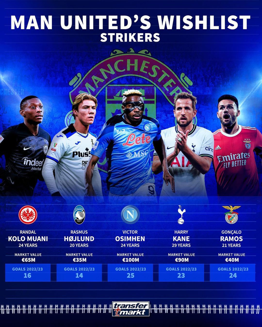 穆阿尼:24岁,身价6500万欧,本赛季已进16球 霍伊伦德:20岁,身价3500万欧,本赛季已进14球 奥斯梅恩:24岁,身价1亿欧,本赛季已进25球 凯恩:29岁,身价9000万欧,本赛季已进23球 贡萨洛-拉莫斯:21岁,身价4000万欧,本赛季已进24球 曼联该选择哪位前锋? |