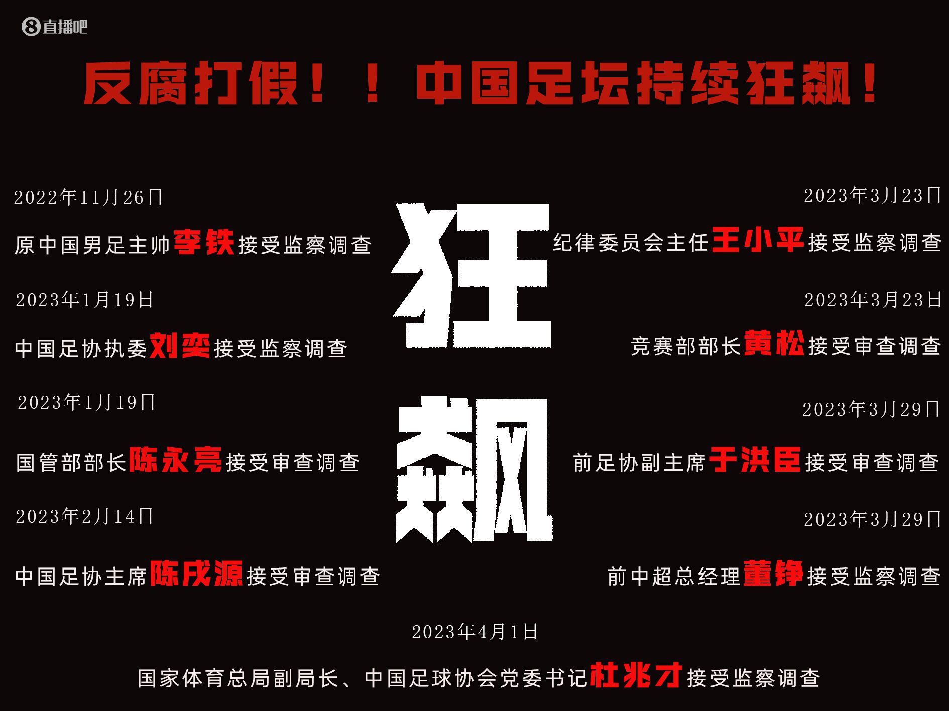 玩球网4月1日讯 中央纪委消息,体育总局副局长、中国足协党委书记、副主席杜兆才接受调查。截至目前,中国足协已有9人被查。 中国足协前任、现任高层被查时间线↓ 2022年11月26日,原中国男足主帅李铁接受监察调查 2023年1月19日,中国足协执委、原秘书长刘奕接受监察调查 2023年1月19日,中国足协常务副秘书长兼国管部部长陈永亮接受审查调查 2023年2月14日,中国足协主席、党委副书记陈戌源接受审查调查 2023年3月23日,中国足协纪律委员会主任王小平接受监察调查、竞赛部部长黄松接受审查调查 2023年3月29日,前中国足协副主席于洪臣接受审查调查、中超公司原总经理董铮接受监察调查 2023年4月1日,体育总局副局长、中国足协党委书记、副主席杜兆才接受调查 ????反腐打假!中国足坛震荡! |