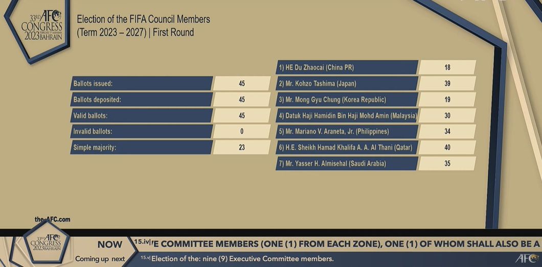 玩球网4月1日讯今年2月,亚足联第33届全体代表大会在巴林举行,中国足协副主席杜兆才参选国际足联理事会理事,在7选5的投票中最终得票18票,排名垫底,落选新任理事。 由于杜兆才落选,亚足联下设的16个专业委员会中,中国足协无任何高层在任。 亚足联新任国际足联理事会理事(2023-2027) 田岛幸三(日本足协主席) 阿拉内塔(菲律宾足协主席) 哈米丁(马来西亚足协主席) 梅沙尔(沙特足协主席) 塔尼(卡塔尔足协副主席) |