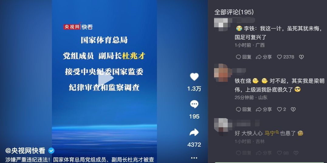 玩球网4月1日讯最新消息,体育总局副局长、足协副主席杜兆才涉嫌严重违纪违法,接受监察调查。央视网快看在社交媒体发布相关新闻,网友纷纷谈到前国足主帅李铁。a.topic-link{margin:1