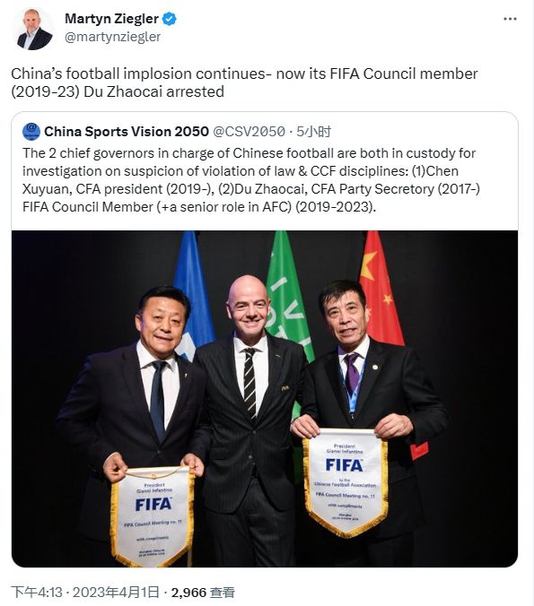 玩球网4月1日讯今日,国家体育总局副局长、党组成员杜兆才接受中央纪委纪律审查和监察调查。事件发生后,还引发了国外记者的关注。泰晤士报首席记者MartynZiegler转发相关报道并写道:中国足球的爆炸