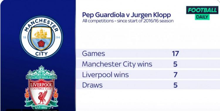 玩球网4月1日讯北京时间今天晚上,曼城将在英超第29轮比赛中主场对阵利物浦。据FootballDaily统计,瓜帅2016-2017赛季担任曼城主帅以来与克洛普交手17次,克洛普7胜5平5负稍占优势。