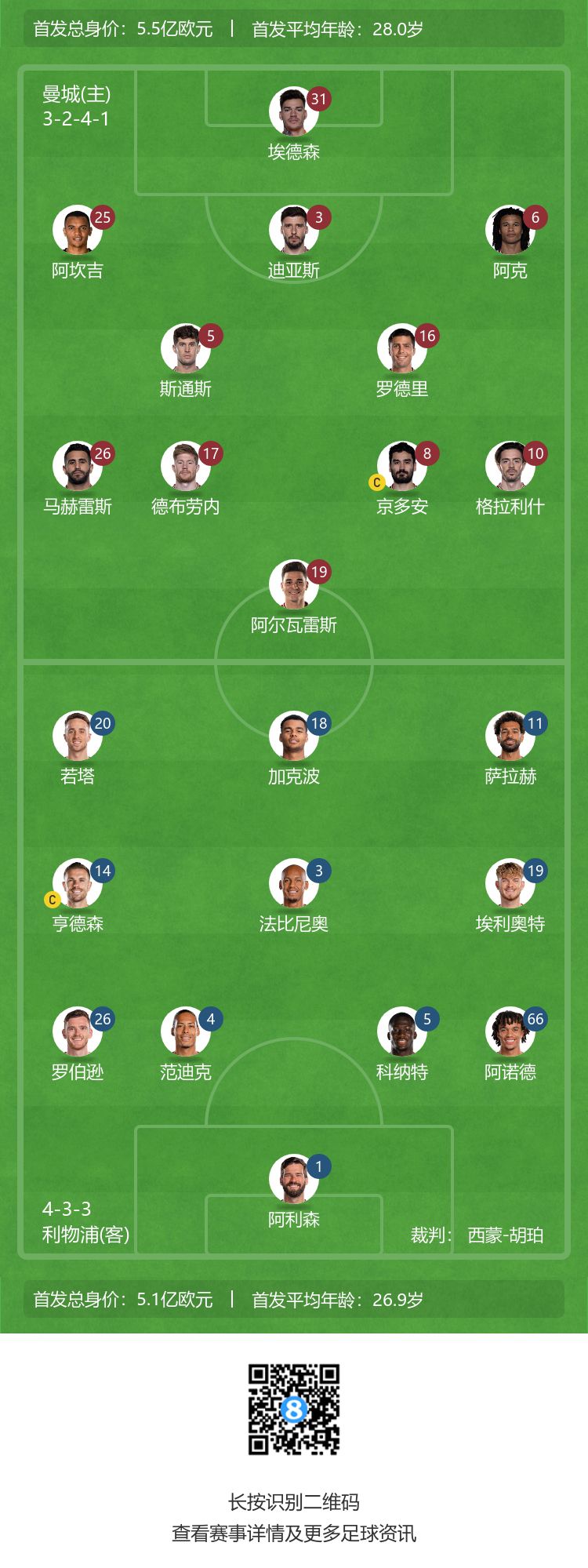 玩球网4月1日讯 北京时间19点30分,英超第29轮,曼城主场对阵利物浦,赛前双方首发公布。哈兰德因腹股沟伤势缺席,福登接受急性阑尾炎手术将伤缺2-3周,努涅斯因身体未恢复到最佳状态替补待命。 曼城首发:31-埃德森、25-阿坎吉、3-迪亚斯、6-阿克、5-斯通斯、16-罗德里、8-京多安、17-德布劳内、26-马赫雷斯、10-格拉利什、19-阿尔瓦雷斯 曼城替补:18-奥尔特加、2-沃克、14-拉波尔特、21-塞尔吉奥-戈麦斯、82-里科-刘易斯、4-菲利普斯、20-B席、80-帕尔默、32-佩洛内 利物浦首发:1-阿利森、4-范迪克、5-科纳特、26-罗伯逊、66-阿诺德、3-法比尼奥、14-亨德森、19-埃利奥特、11-萨拉赫、18-加克波、20-若塔 利物浦替补:62-凯莱赫、2-乔-戈麦斯、21-齐米卡斯、32-马蒂普、7-米尔纳、15-张伯伦、29-阿图尔、9-菲尔米诺、27-努涅斯 目前英超积分榜上,曼城19胜4平4负积61分,位列第二,少赛一场落后榜首阿森纳8分;利物浦12胜6平8负积42分,位列第6。双方本赛季联赛首次交锋中,利物浦凭借萨拉赫的进球1-0小胜曼城。 (木辛) |