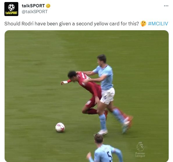 英媒talkSPORT发问,这球罗德里是否该吃到第二张黄牌?