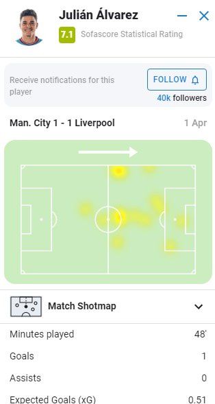玩球网4月1日讯曼城vs利物浦的比赛正在进行当中,两队以1-1的比分结束上半场,以下为阿尔瓦雷斯上半场的数据。上半场,阿尔瓦雷斯的预期进球数为0.51球,有1次射正,打进1球。这位阿根廷前锋有16次触