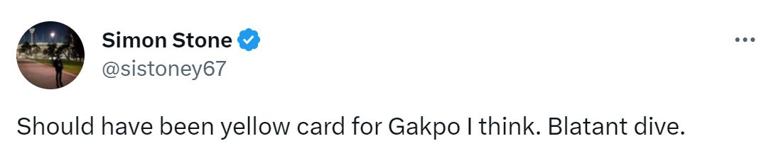 西蒙-斯通:我认为应该给加克波出示黄牌。公然跳水。