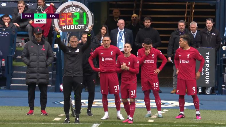 玩球网4月1日讯英超第29轮,曼城主场对阵利物浦,比赛第69分钟,努涅斯、张伯伦、菲尔米诺、齐米卡斯登场,萨拉赫、罗伯逊、埃利奥特、若塔被换下。