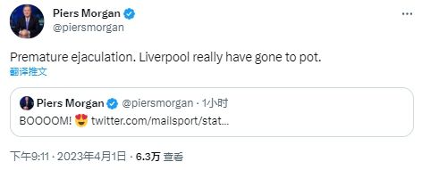 摩根转发了自己在利物浦领先时的推文,写道:“早泄。利物浦真的已经垮了。”