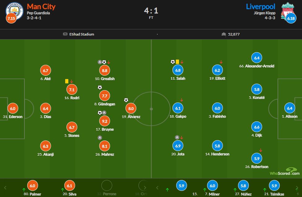 玩球网4月1日讯在刚刚结束的英超联赛中,曼城主场4比1逆转利物浦。在赛后Whoscored的评分中,传射的德布劳内全场最高9.2分、格拉利什8.8次席、马赫雷斯8.1分;利物浦方面,最高分为若塔的6.