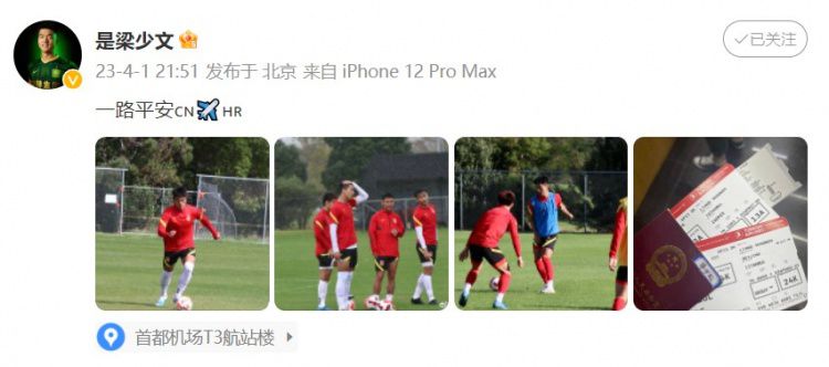 玩球网4月1日讯今天,国安小将梁少文前往国奥队报到。梁少文在个人微博中晒出了多张配图,并写道:一路平安。此前,梁少文跟随国足亚运队前往新西兰参加热身赛。根据安排,阿布拉汗、陶强龙、刘祝润、阿卜杜肉苏力
