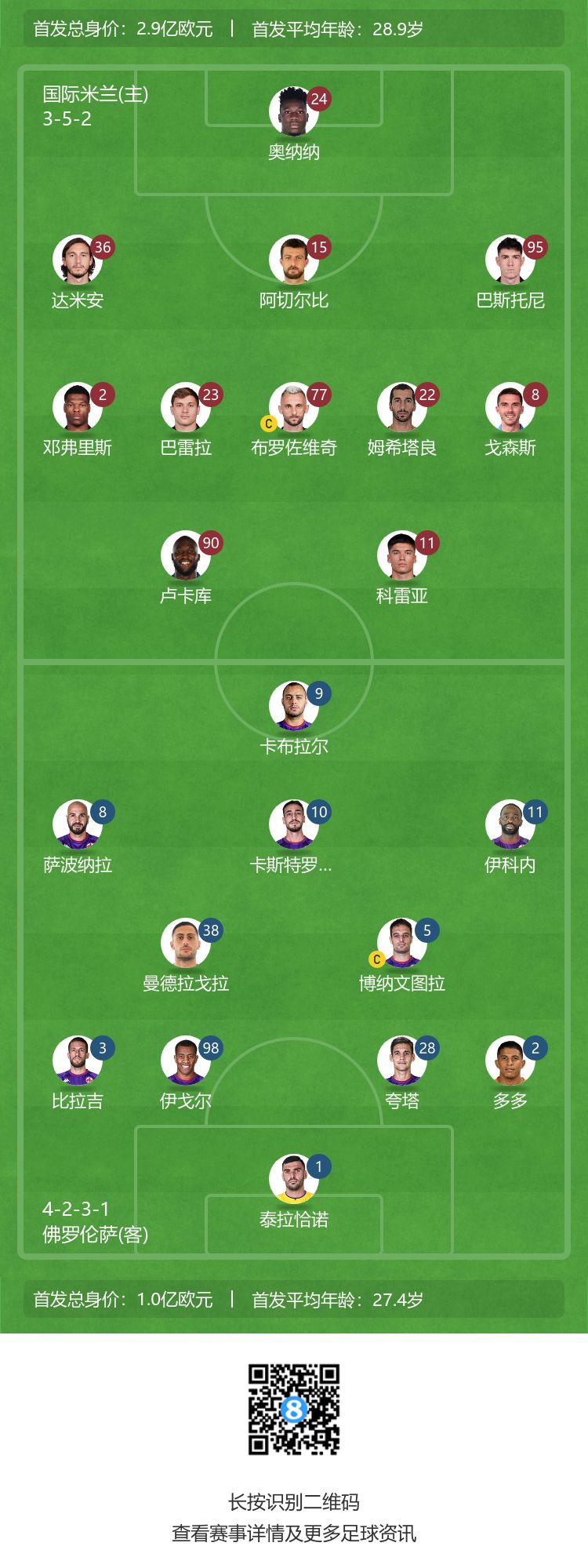 玩球网4月1日讯北京时间04月02日星期日00:00,意甲第28轮,国米主场迎战佛罗伦萨。赛前,双方公布首发名单。国米首发:24-奥纳纳、8-戈森斯、15-阿切尔比、36-达米安、95-巴斯托尼、2-