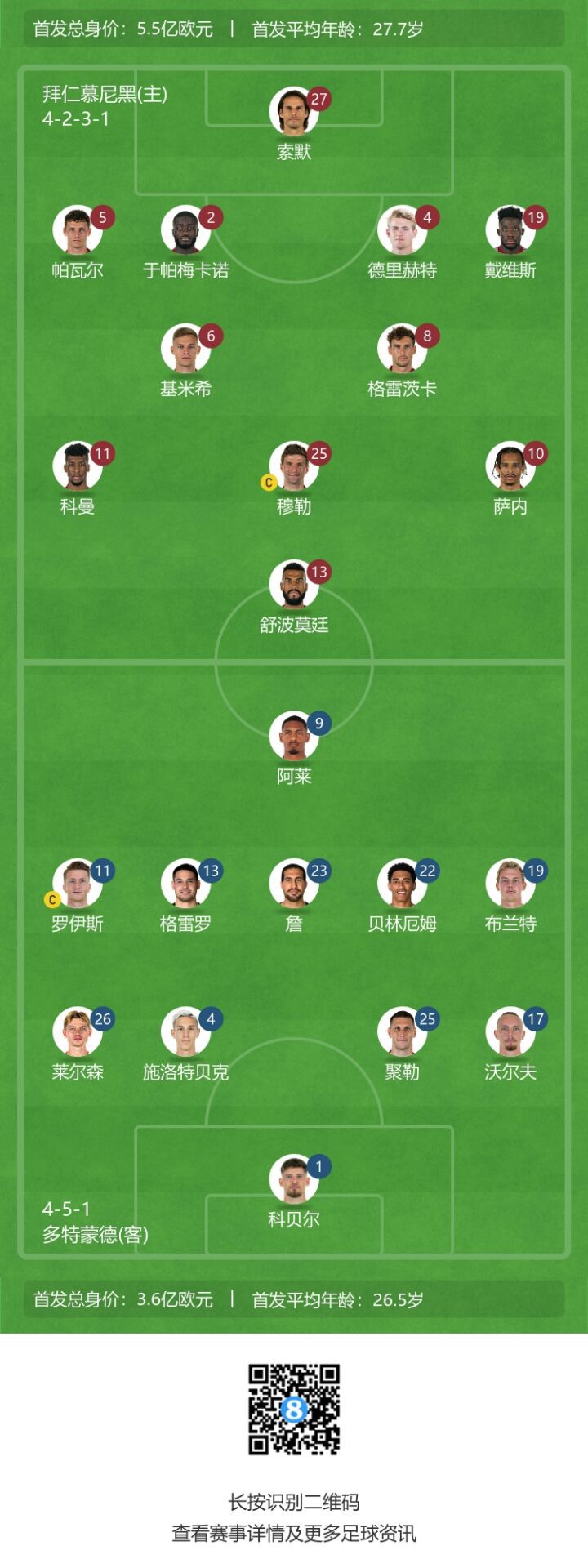 玩球网4月1日讯德甲第26轮,拜仁主场迎战多特。赛前,官方公布首发名单。本场是图赫尔执教拜仁首秀,拜仁排出4231。拜仁首发:27-索默、2-于帕梅卡诺、4-德里赫特、5-帕瓦尔、19-阿方索-戴维斯