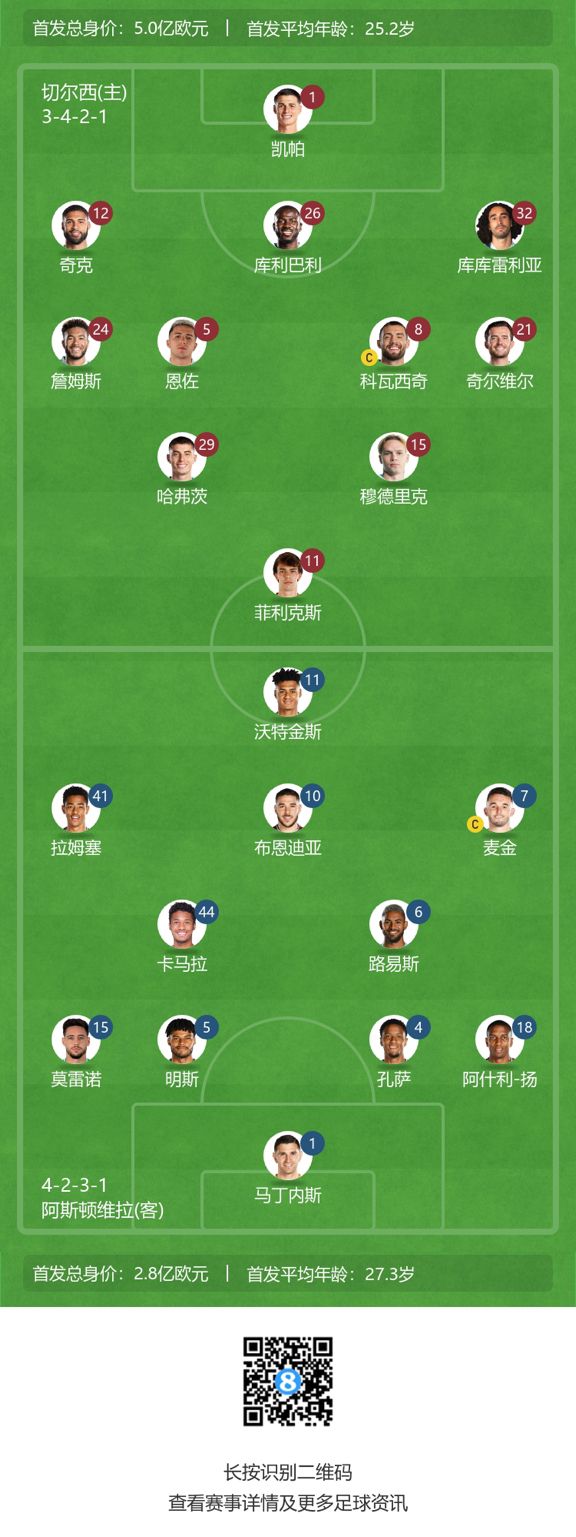 玩球网4月1日讯凌晨00:30,英超第29轮,切尔西主场迎战阿斯顿维拉,赛前首发名单公布。切尔西首发:1-凯帕、12-奇克、26-库利巴利、32-库库雷利亚、24-詹姆斯、21-奇尔维尔、5-恩佐、8
