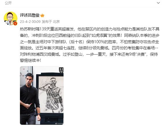 玩球网4月2日讯英超第29轮,阿森纳4-1利兹联,赛后著名评述员詹俊对这场比赛做出了点评。詹俊:“热苏斯时隔139天重返英超首发,他在禁区内的创造力与抢点能力是其他队友不具备的,冲刺阶段这位巴西前锋的