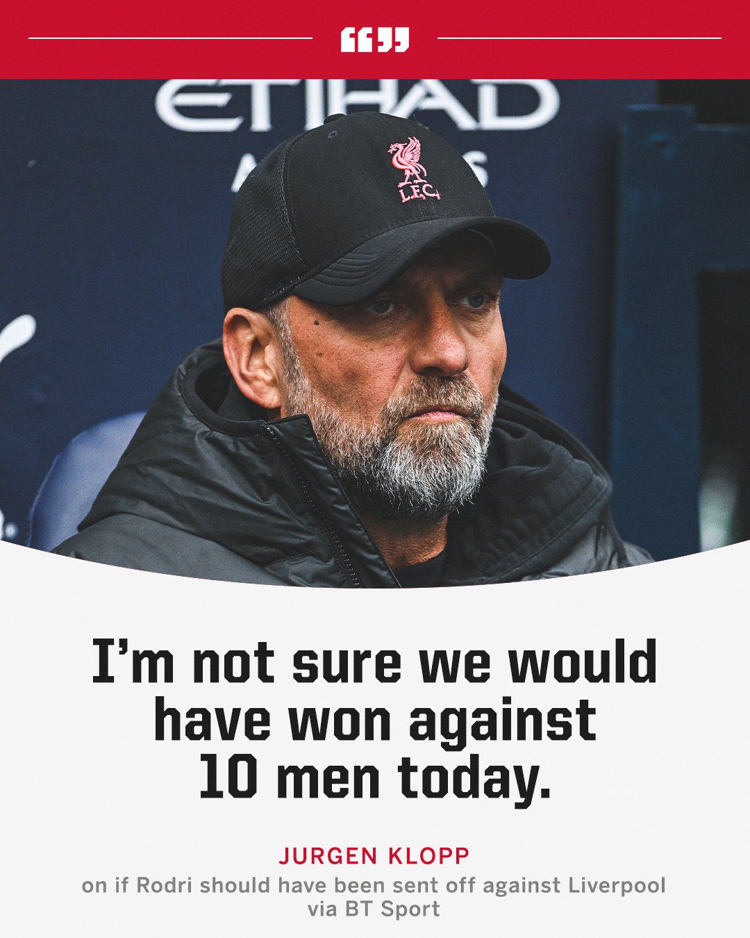 玩球网4月2日讯 英超第29轮,曼城主场4-1大胜利物浦。 赛后,利物浦主帅克洛普在采访中被问到对罗德里逃红的看法时,他表示罗德里很幸运地依然留在场上,但这并不是借口。 “我不认为这是个足够好的决定,他会得到第二张黄牌吗?可能吧,但他现在不会得到,我不确定今天能赢10人作战的曼城。” 比赛中,罗德里因拉倒若塔吃到了第一场黄牌↓ 之后,罗德里拉倒加克波,裁判则没有再次出牌↓ |