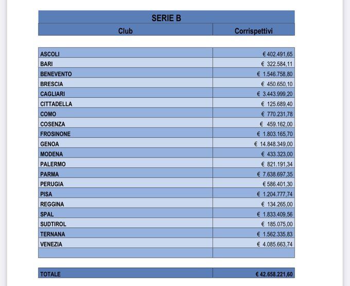 玩球网4月2日讯意大利记者Alessandro Alciato今天列出了意乙俱乐部在2022年向经纪人支付的费用列表,热那亚1484万欧元最多。 2022年,意乙俱乐部共向经纪人支付了4265万8221.6欧元,各支俱乐部情况具体如下(排名按俱乐部首字母顺序): 阿斯科利,40万2491.65欧元 巴里,32万2584.11欧元 贝内文托 ,154万6758.80欧元 布雷西亚,45万0650.10欧元 卡利亚里,344万3999.20万欧元 奇塔代拉,12万5689.4欧元 科莫,77万0231.78欧元 科森扎,45万9162欧元 弗洛西诺内,180万3165.70欧元 热那亚,1484万8349.00欧元 莫德纳,43万3323.00欧元 巴勒莫,82万1191.34欧元 帕尔马,763万8697.35欧元 佩鲁贾,58万6401.30欧元 比萨,120万4777.74欧元 雷吉纳,13万4265.00欧元 斯帕尔,183万3409.56欧元 南蒂罗尔,18万5075.00欧元 特尔纳纳,156万2335.83欧元 威尼斯,408万5663.74欧元 共计:4265万8221.6欧元 (地精杀手) |
