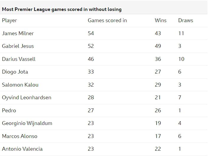 玩球网4月2日讯英超第29轮,热苏斯梅开二度助阿森纳4-1战胜利兹联。据统计,热苏斯进球的52场英超联赛中,他所在的球队49胜3平保持不败。这一纪录仅次于米尔纳,BBC借此机会盘点了英超联赛历史上进球