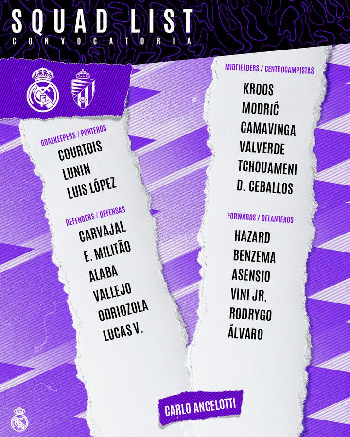 玩球网4月2日讯北京时间今天晚上,皇马将在西甲第27轮比赛中主场对阵巴拉多利德,皇马公布了此役的球员名单,本泽马、阿扎尔、阿拉巴在列,纳乔(停赛)、吕迪格、门迪、马里亚诺缺席。皇马对阵巴拉多利德大名单