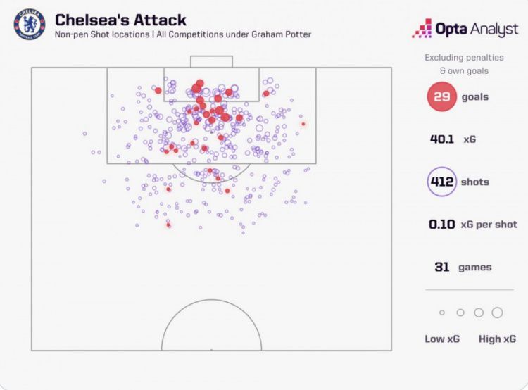 玩球网4月2日讯在英超第29轮比赛中,切尔西主场0比2不敌阿斯顿维拉。Opta统计了波特上任以来切尔西的进攻数据,蓝军31场比赛打进29球,每次射门的预期进球为0.1粒。波特麾下切尔西进攻数据:比赛—