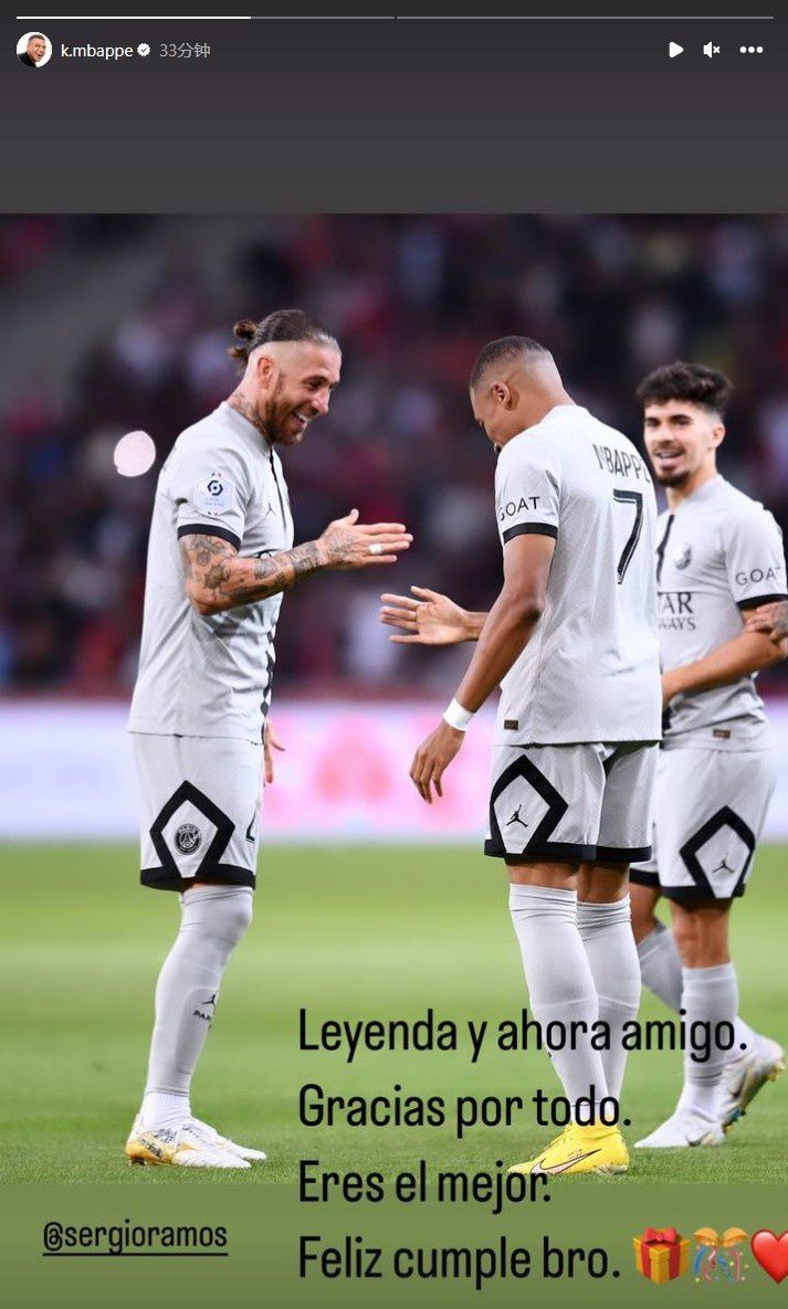 玩球网3月30日讯今天是拉莫斯的37岁生日,姆巴佩在Instagram发文为他送上祝福。