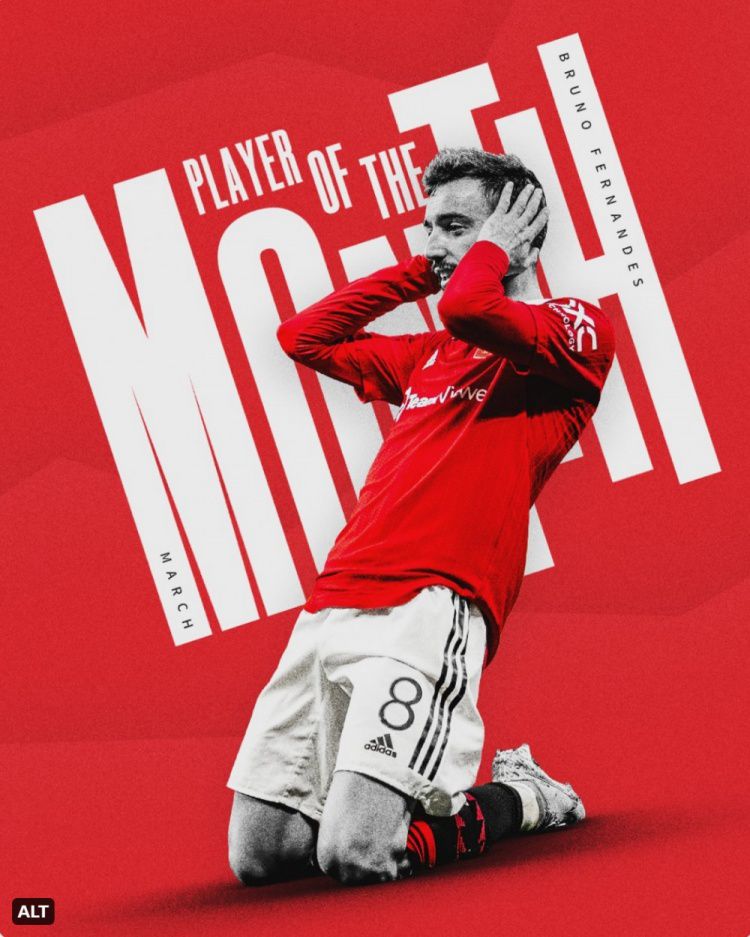 玩球网3月30日讯曼联官方宣布,布鲁诺-费尔南德斯当选队内3月份最佳球员。B费3月份为曼联出战6场比赛,贡献3球2助,曼联官方账号在社交媒体上晒出为B费制作的海报,确认他当选曼联队内3月最佳球员。本赛