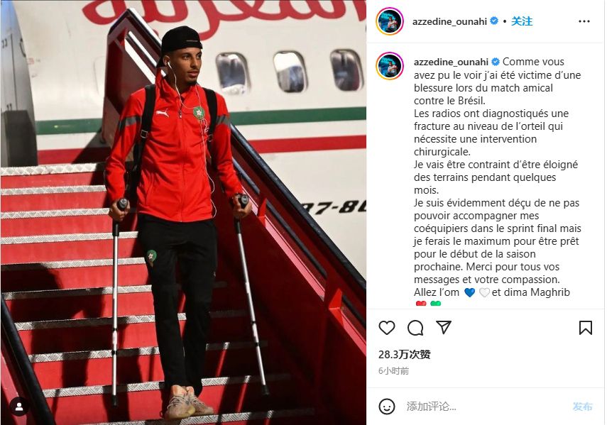 玩球网3月31日讯马赛中场奥纳西今天在Instagram发文,谈到自己赛季报销的事情。奥纳西写道:“如你们所见,我在对阵巴西的友谊赛中遭遇了伤病,X光片诊断出我的脚趾有骨折,需要手术,我将不得不因此离