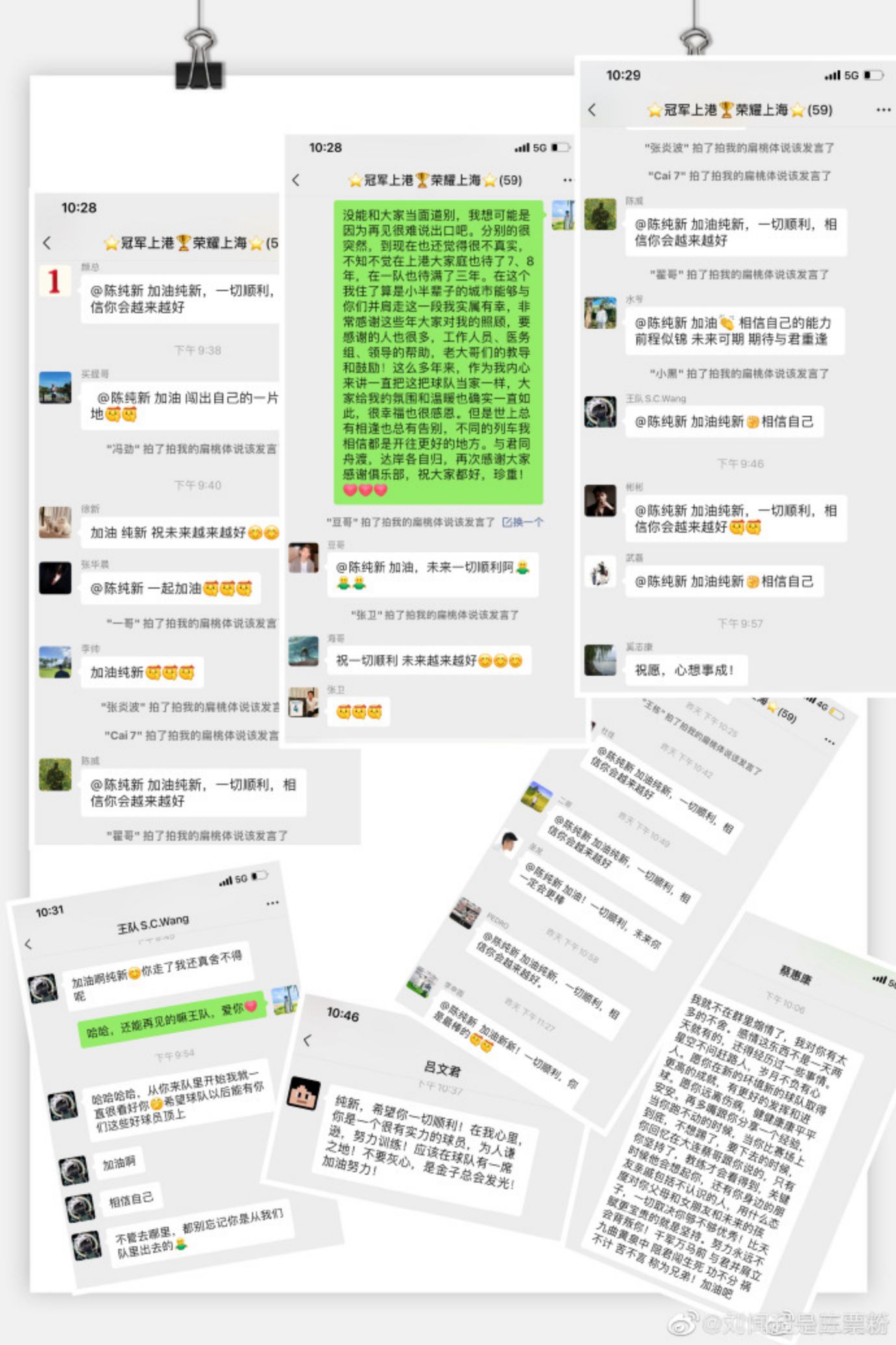 玩球网3月31日讯 在海港队内微信群,海港球员祝福离队的陈纯新。 陈纯新今天凌晨发文,向效力8年的海港告别,这位25岁的球员一直在海港队效力,2020年提拔进入一线队,他新赛季将加盟中超升班马青岛海牛。 据《东方体育日报》记者刘闻超消息,在海港队内的微信群,陈纯新发文向队友和工作人员告别,队友和工作人员也向他送上祝福。 (Luca) |