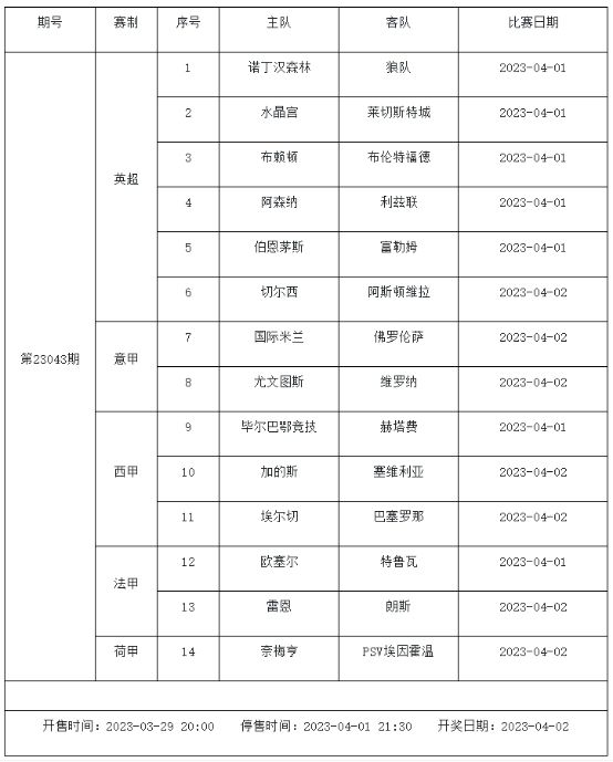 传统足彩第23043期的赛事主要由英超、意甲、西甲和法甲组成。在经历了国际比赛日之后,五大联赛战火重燃,阿森纳、切尔西、尤文和巴萨等豪门纷纷入选了本期足彩,各支豪门球队均是国脚大户,需对各队人员状况予