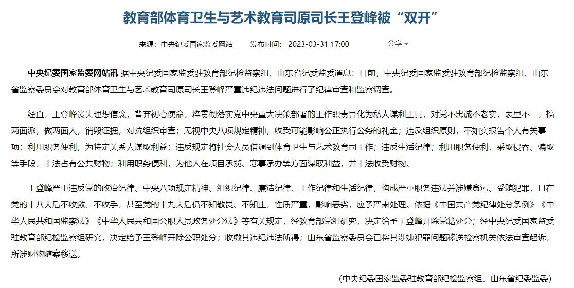 中央纪委国家监委网站讯 据中央纪委国家监委驻教育部纪检监察组、山东省纪委监委消息:日前,中央纪委国家监委驻教育部纪检监察组、山东省监察委员会对教育部体育卫生与艺术教育司原司长王登峰严重违纪违法问题进行了纪律审查和监察调查。 经查,王登峰丧失理想信念,背弃初心使命,将贯彻落实党中央重大决策部署的工作职责异化为私人谋利工具,对党不忠诚不老实,表里不一,搞两面派,做两面人,销毁证据,对抗组织审查;无视中央八项规定精神,收受可能影响公正执行公务的礼金;违反组织原则,不如实报告个人有关事项;利用职务便利,为特定关系人谋取利益;违反规定将社会人员借调到体育卫生与艺术教育司工作;违反生活纪律;利用职务便利,采取侵吞、骗取等手段,非法占有公共财物;利用职务便利,为他人在项目承揽、赛事承办等方面谋取利益,并非法收受财物。 王登峰严重违反党的政治纪律、中央八项规定精神、组织纪律、廉洁纪律、工作纪律和生活纪律,构成严重职务违法并涉嫌贪污、受贿犯罪,且在党的十八大后不收敛、不收手,甚至党的十九大后仍不知敬畏、不知止,性质严重,影响恶劣,应予严肃处理。依据《中国共产党纪律处分条例》《中华人民共和国监察法》《中华人民共和国公职人员政务处分法》等有关规定,经教育部党组研究,决定给予王登峰开除党籍处分;经中央纪委国家监委驻教育部纪检监察组研究,决定给予王登峰开除公职处分;收缴其违纪违法所得;山东省监察委员会已将其涉嫌犯罪问题移送检察机关依法审查起诉,所涉财物随案移送。 (中央纪委国家监委驻教育部纪检监察组、山东省纪委监委) ------------------------------------------------------------------------------------------------------ 王登峰2015年起担任全国青少年校园足球工作领导小组办公室主任;2022年6月1日,王登峰担任中国青少年足球联赛赛事办公室副主任。 2022年8月,据中央纪委国家监委驻教育部纪检监察组、山东省纪委监委消息:教育部体育卫生与艺术教育司司长王登峰涉嫌严重违纪违法,接受中央纪委国家监委驻教育部纪检监察组纪律审查和山东省监察委员会监察调查。 相关阅读:王登峰旧采访:足球操既不是校园足球,也不是形式主义 全国校足办主任王登峰:校园足球7年发展,5500万名学生参与 石雪清怒批王登峰:他对中国足球的破坏力,超过他贪污受贿的罪过 教育部体育卫生与艺术教育司原司长王登峰被正式批捕 |