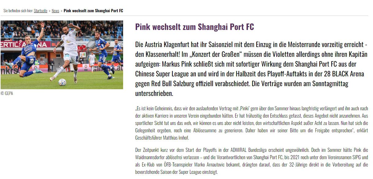 玩球网4月2日讯奥地利超级联赛球队克拉根福的官方消息,队内主力中锋马库斯-平克正式转会到中超球队上海海港。目前克拉根福进入到了奥超联赛争冠组,该队总经理表示:“众所周知我们希望与平克延长合同,但是他很