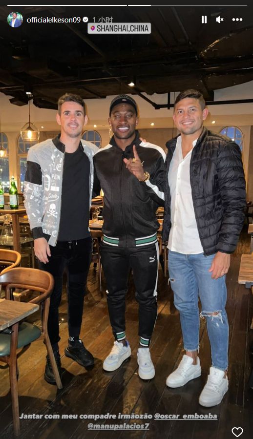 玩球网4月2日讯中国男足球员艾克森在社交媒体晒照,与奥斯卡以及成都蓉城新外援帕拉西奥斯合影。